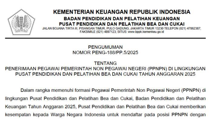 Rekrutmen Pegawai Pemerintah Non Pegawai Negeri (PPNPN) Pusdiklat Bea dan Cukai 2025 resmi dibuka, ini cara dan syarat pendaftarannya.