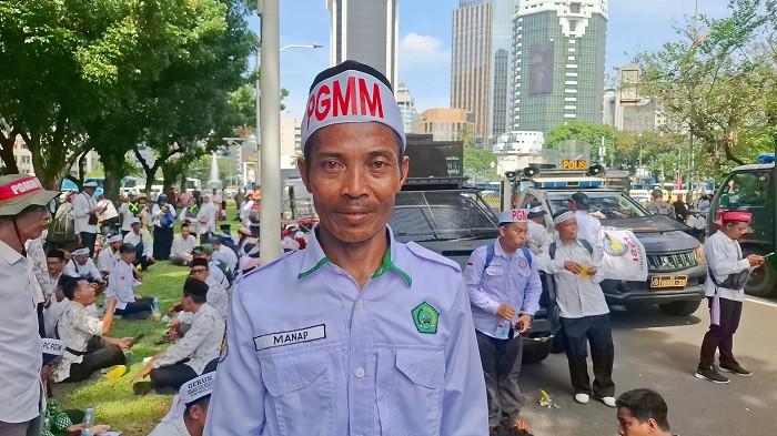 TRIBUNNEWS.COM, JAKARTA - Keringat terus mengalir di wajah Manap, seorang guru asal Cianjur Selatan, Jawa Barat. Manap sedang memperjuangkan tuntutannya dalam aksi yang digelar sejumlah guru madrasah swasta di kawasan Monas, Jakarta Pusat pada Kamis (30/10/2025).