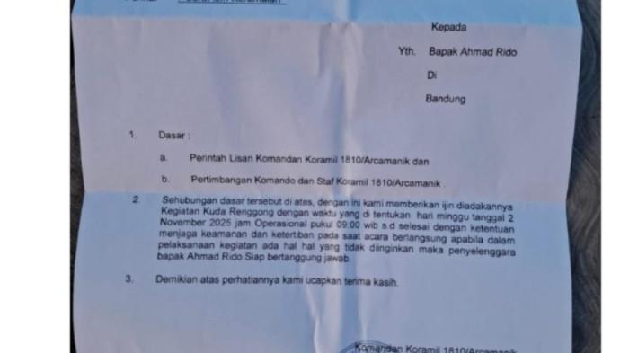 TRIBUNNEWS.COM, JAKARTA - Beredar di media sosial surat yang berisi pemberian izin keramaian yang dikeluarkan oleh Koramil 1810/Arcamanik, Minggu (2/11/2025).