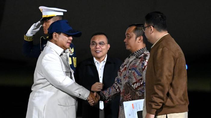 Setibanya di Pangkalan TNI Angkatan Udara Halim Perdanakusuma, Jakarta, Presiden Prabowo disambut oleh Wakil Ketua DPR Sufmi Dasco Ahmad, Menteri Sekretaris Negara Prasetyo Hadi, serta Kepala Badan Komunikasi Pemerintah Angga Raka Prabowo.