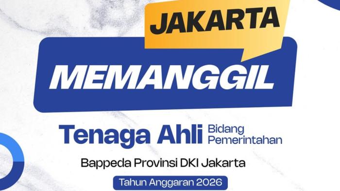 Bappeda Provinsi DKI Jakarta resmi membuka seleksi Tenaga Ahli Bidang Pemerintahan 2026. Pendaftaran dibuka hingga 20 November 2025.