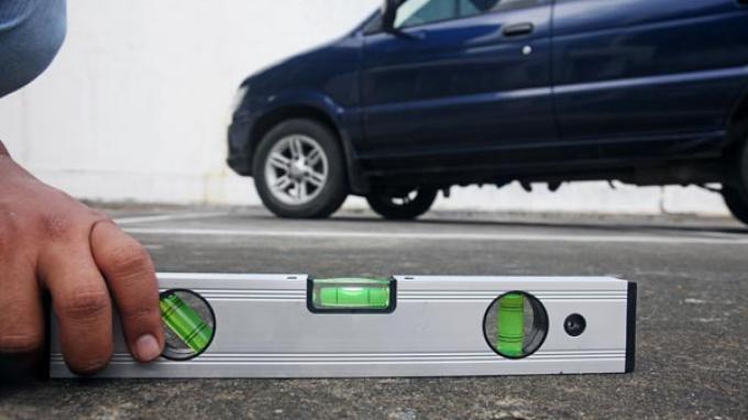 Gunakan waterpass untuk memastikan datarnya kondisi tempat parkir. Posisikan waterpass dua kali dengan posisi diagonal saling menyilang, atau seperti membuat huruf X.