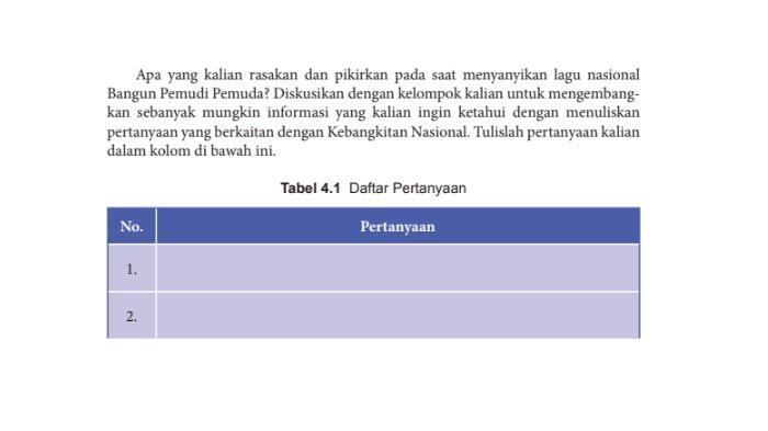 Kunci Jawaban PKn Kelas 8 Halaman 76 Semester 2, Tabel 4.1: Pertanyaan Seputar Kebangkitan Nasional