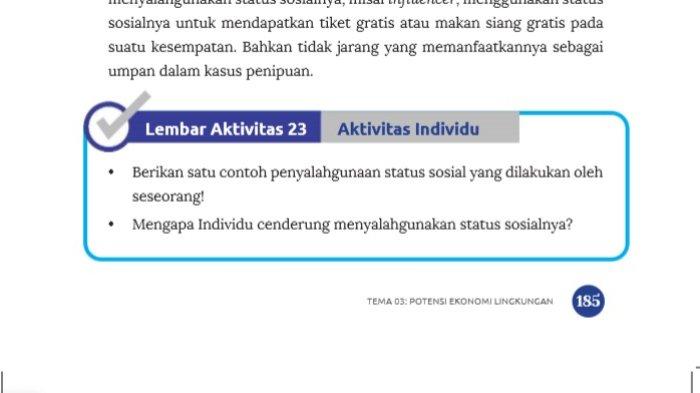 Di halaman 185 Bab 3 tentang potensi ekonomi lingkungan pada bagian Lembar Aktivitas 23 membahas penyalahgunaan status sosial.