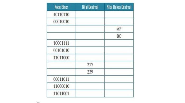 Lengkapi tabel berikut untuk mencari nilai-nilai biner, heksadesimal, dan nilai desimalnya!