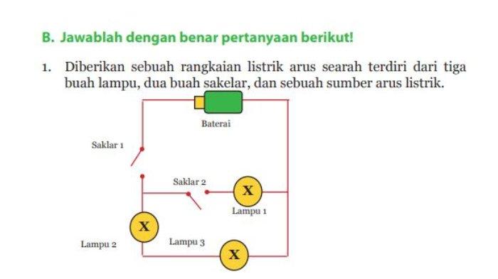1. Diberikan sebuah rangkaian listrik arus searah terdiri dari tiga buah lampu, dua buah sakelar, dan sebuah sumber arus listrik.