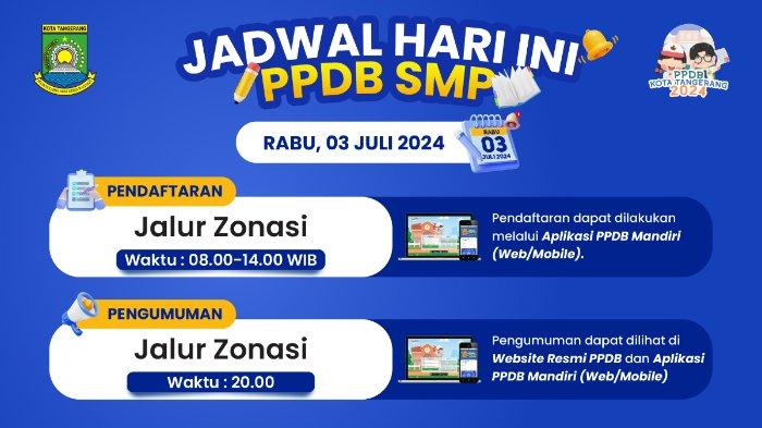 Menurut jadwal, pengumuman hasil seleksi PPDB SMP Kota Tangerang 2024 jalur Zonasi dilaksanakan pada hari ini, Rabu (3/7/2024) pukul 20.00 WIB.