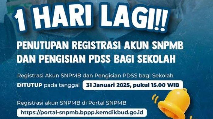 TRIBUNNEWS.COM - Registrasi akun SNPMB sekolah dan pengisian PDSS ditutup besok, Jumat, 31 Januari 2025, pukul 15.00 WIB.