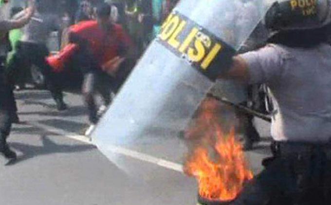 Blokade yang dilakukan peserta aksi mencoba menghalangi petugas kepolisian yang hendak memadamkan ban bekas yang terbakar tepat di perempatan jalan. Keributan antara aparat dengan peserta aksi tidak dapat terhindarkan.