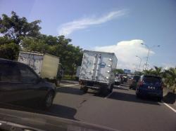 Jalan poros itu macet. Sebagian pengendara memilih akses jalan tol. Walhasil, tol yang selalu lancar kebagian imbas, ikut macet.