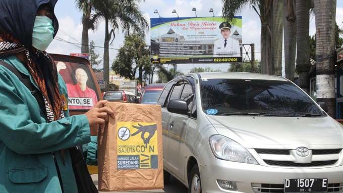 Mereka membawa dus kecil sebagai wadah sumbangan koin yang bertuliskan "ngumpulkan sajuta coin kanggo jalan Sumedang yang langkung sae menyodorkan dus ke kendaraan yang lewat."