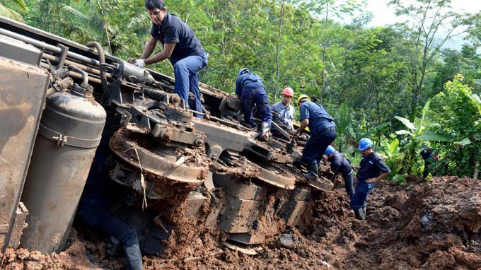 Kereta penumpang KA Malabar yang anjlok di Desa Mekarsari, Kecamatan Kadipaten, Tasikmalaya, Jawa Barat mulai diangkat