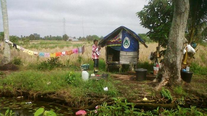 Gubuk berukuran 2x3 meter yang keseluruhan terbuat dari kayu, beratap daun rumbia dan terpal itu selama setengan bulan terakhir ditempati oleh Santi dan dua anak kembarnya Nazma dan Jazla.