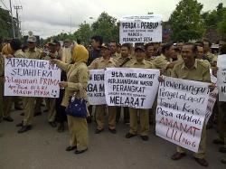 TRIBUNNEWS.COM,MADIUN - Tuntut penghasilan dan pengelolaan tanah bengkok, Ratusan perangkat desa beserta Kepala Desa (Kades) se Kabupaten Madiun berdemo ke kantor DPRD Kabupaten Madiun, Selasa (20/01/2015).