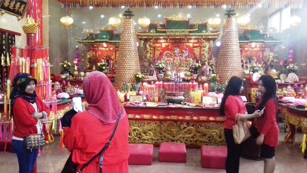 Kemeriahan di dalam klenteng dimanfaatkan Aan dan rekannya untuk berfoto.
