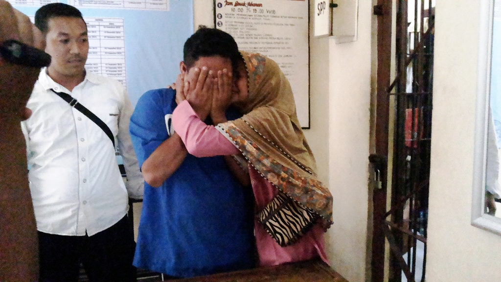 Sang ibu tampak tak tega melihat anaknya digelandang polisi untuk menjalani pemeriksaan.