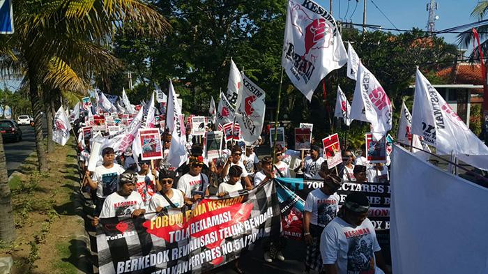 Seruan batalkan Pepres 51 tahun 2014, Tolak Reklamasi Teluk Benoa dan semangat puputan membakar pengunjuk rasa meski matahari terik, Minggu (12/6/2016).