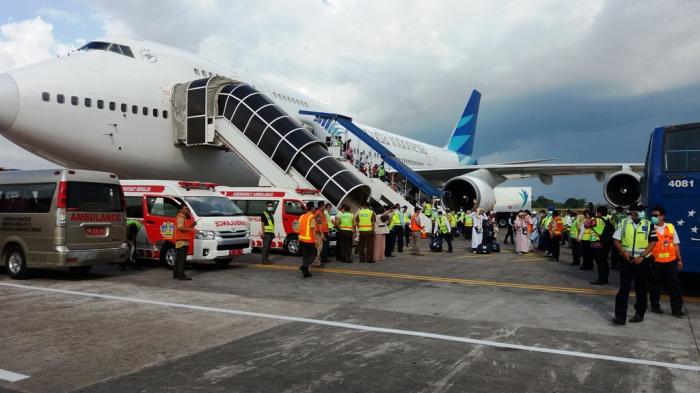 Satu persatu jamaah kemudian turun dari pesawat. Sebelum turun dari pesawat, para jamaah haji terlebih dahulu diperiksa kondisi kesehatannya oleh petugas PPIH Debarkazi Makassar.