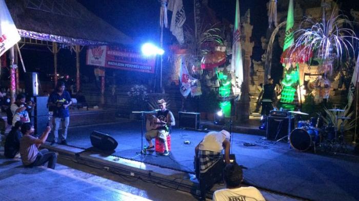 TRIBUNNEWS.COM, DENPASAR - Jerinx drummer band punk rock Superman is Dead dan Mike pentolan band punk Marjinal memeriahkan konser mini warga Desa Adat Kepaon dan Desa Adat Pemogan.