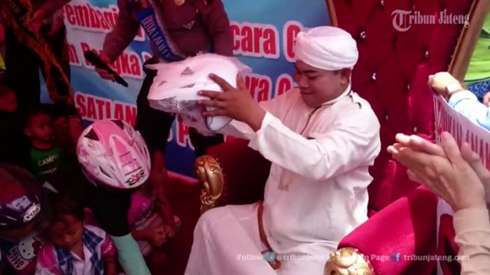 Polres Kudus menampilkan "Dimas Kanjeng Taat Berlalulintas" dengan mengenakan pakaian jubah putih dan pegang tasbih besar, serta duduk di kursi singgasana warna merah.