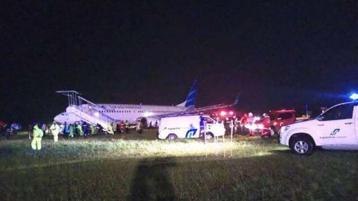 Pesawat Garuda Indonesia tergelincir di landasan pacu Bandara Adisutjipto, Yogyakarta, Rabu (1/2/2017) pukul 19.51 WIB di tengah hujan lebat.