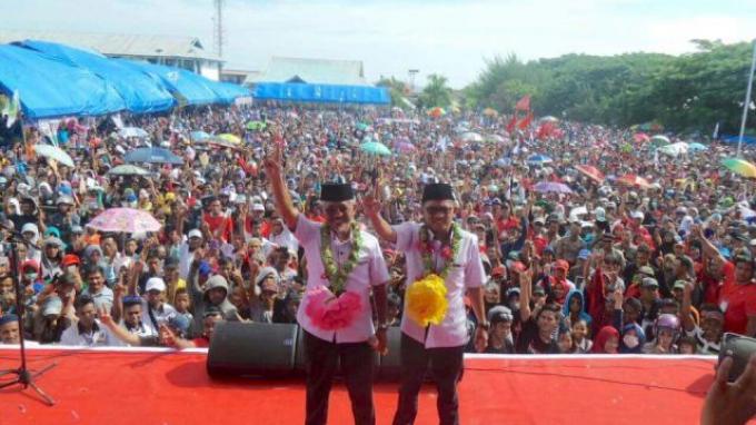 TRIBUNNEWS.COM - Lapangan Merdeka Boepinang-Poleang dipadati puluhan ribu orang saat kampanye akbar pasangan calon Bupati Bombana ,Ir H Kasra Jaru Munara dan H Man Arfah, Jumat (10/2/2017).