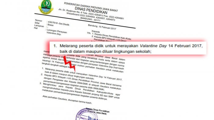 Dinas Pendidikan Jawa Barat mengeluarkan surat edaran yang melarang para pelajar di Jabar merayakan Hari Kasih Sayang