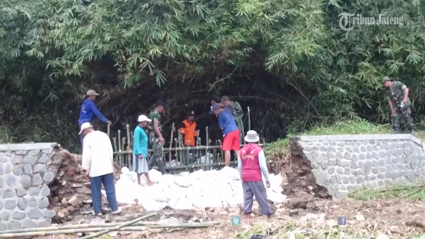"Kemarin hujan deras dan arus air begitu deras. Sekitar pukul 15.00, tanggul jebol sehingga air melimpas ke persawahan dan permukiman," kata Tumiran, seorang warga yang turut dalam kegiatan tersebut.
