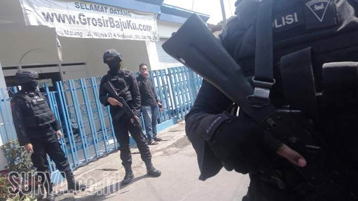 Polisi Resort Malang bersama Brimob Pelopor B Polda Jatim mengamankan rumah seorang warga terduga teroris di Jl Wijaya 11 A Singosari.