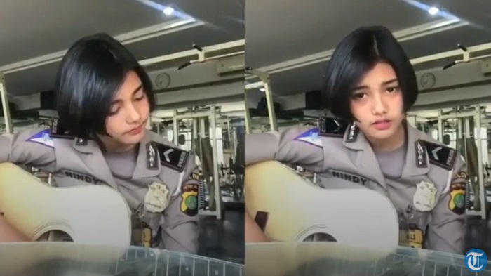 Masih mengenakan seragam tugas, polwan yang bernama Nindy tersebut bernyanyi sambil sesekali memetik gitarnya.