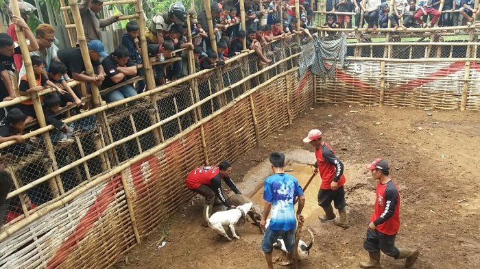 TRIBUNNEWS.COM, PACET - Gonggongan puluhan anjing santer terdengar di sekitar area dugong (adu bagong) yang digelar di sebuah tegalan di Kampung Cisindang, Desa Cikawao, Kecamatan Pacet, Kabupaten Bandung, Minggu (22/10/2017) siang.