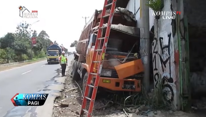 Insiden itu menarik perhatian warga. Menurut saksi mata, rem truk rusak sehingga pengemudi tak bisa mengendalikan lajunya.(*)