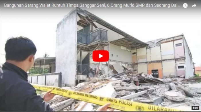 TRIBUNNEWS.COM - Sebanyak tujuh orang meninggal akibat runtuhnya bangunan sarang walet dan timpa sanggar seni di Gegesik, Kabupaten Cirebon, Senin (16/4/2018).
