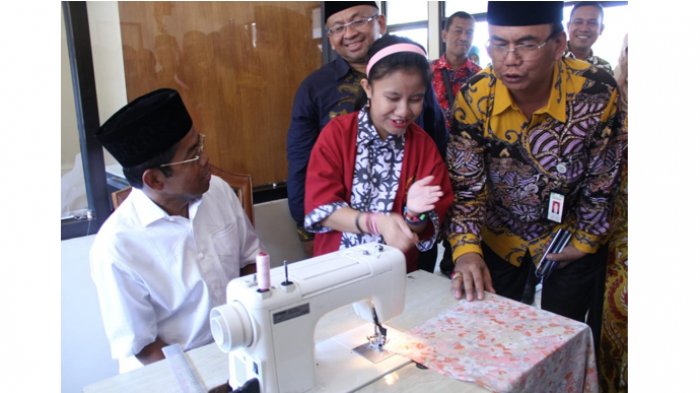 Dalam kunjungan ini, selain meninjau beragam fasilitas dan layanan, Mensos juga menjajal keterampilan menjahit bersama penyandang disabilitas intelektual.