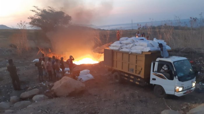 Kejari Maumere Bakar Ribuan Karung Berisi Pakaian Rombengan