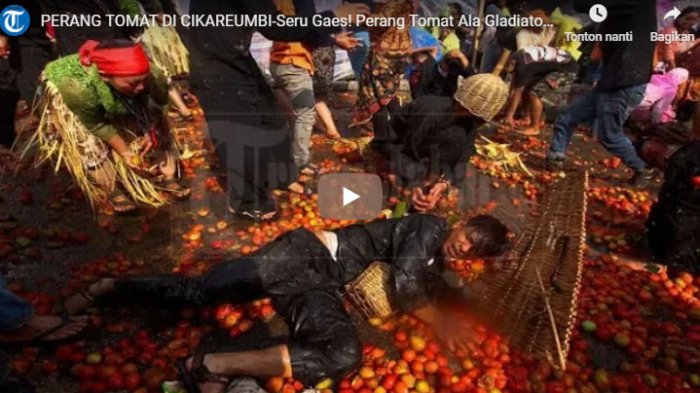 TRIBUNNEWS.COM, LEMBANG - Sejak pukul 08.00 wib, warga Kampung Cikareumbi RW 3, Desa Cikidang, Kecamatan Lembang telah mulai memadati jalan desa sepanjang 100 meter yang disulap menjadi tempat ruwatan lembur sekaligus arena peperangan adu tomat, Minggu (28/10/2018).