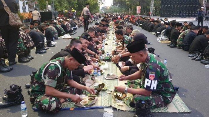 TRIBUNNEWS.COM, SOLO - Ribuan personel TNI-Polri dan perwakilan organinasi masyarakat (ormas) makan bersama di Plaza Manahan, Jalan Adi Sucipto, Kota Solo, Rabu (26/6/2019) sore.
