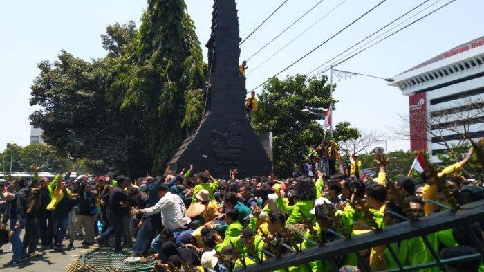 TRIBUNNEWS.COM, SEMARANG - Massa mahasiswa yang berunjuk rasa di depan Kompleks Kantor Gubernur Jawa Tengah, Semarang, menjebol gerbang, Selasa (24/9/2019) pukul 11.45 WIB.