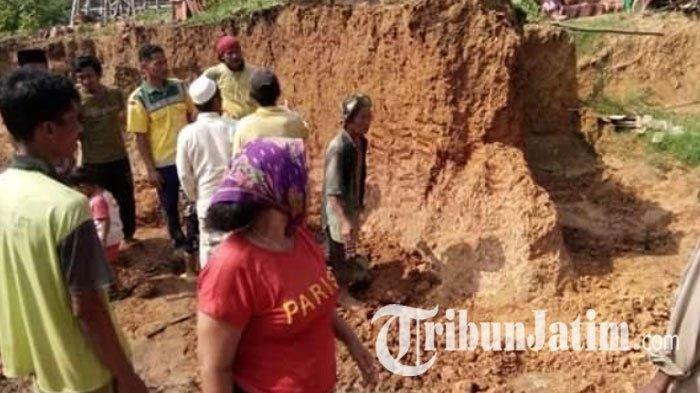 TRIBUNNEWS.COM, SAMPANG - Seorang pengrajin genting di Dusun Angsanah Barat, Desa Bluuran, Kecamatan Karang Penang, Kabupaten Sampang, Madura tertimbun tanah longsor saat bekerja, Senin (23/12/2019).