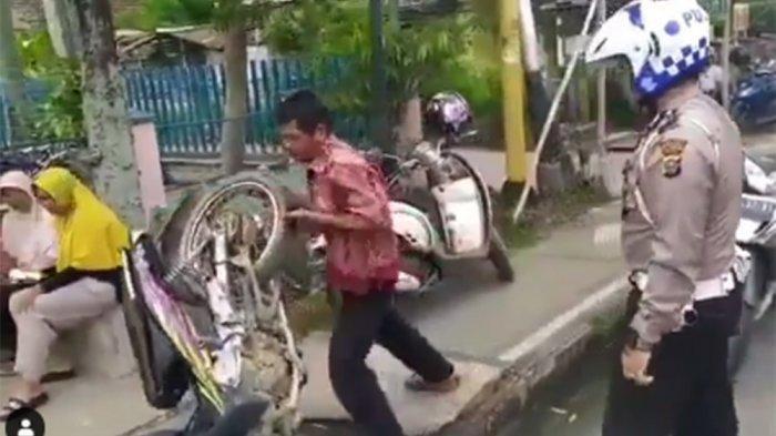 Polantas kemudian mencoba mendirikan motor, tapi si pria mencegahnya.