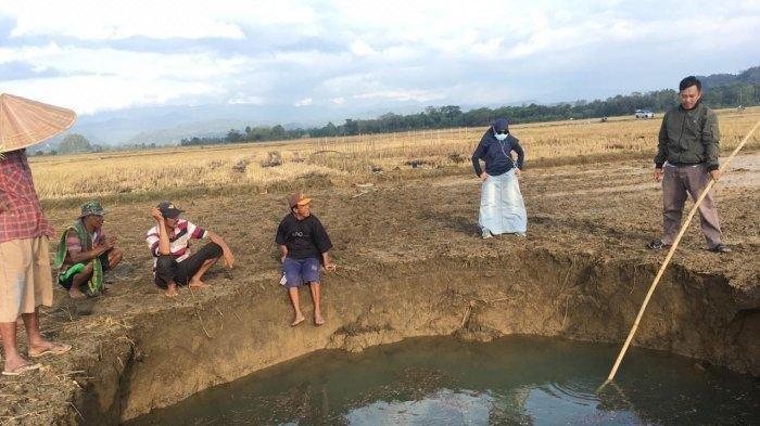 "Pas mereka pergi lihat ternyata ada lubang besar di tengah sawah berisi air. Waktu kejadian mereka tidak mendengar adanya tanda-tanda atau suara apapun," ungkapnya.