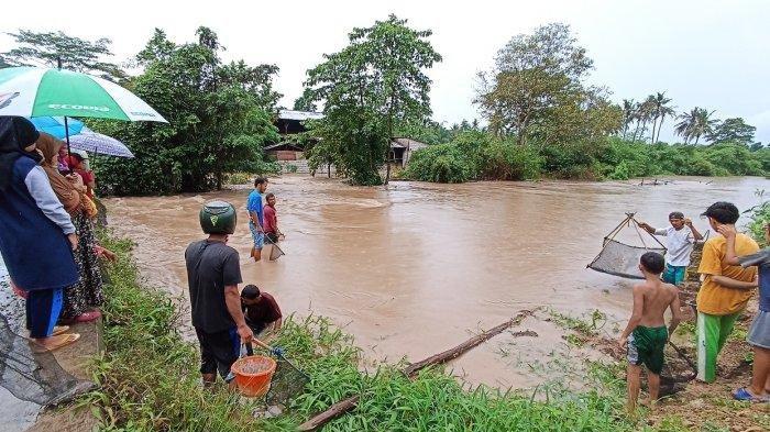 Sejumlah warga berbondong-bondong mencari ikan lele di sungai yang berada di Kelurahan Sukalaksana, Kecamatan Curug, Kota Serang, Selasa (1/3/2022).