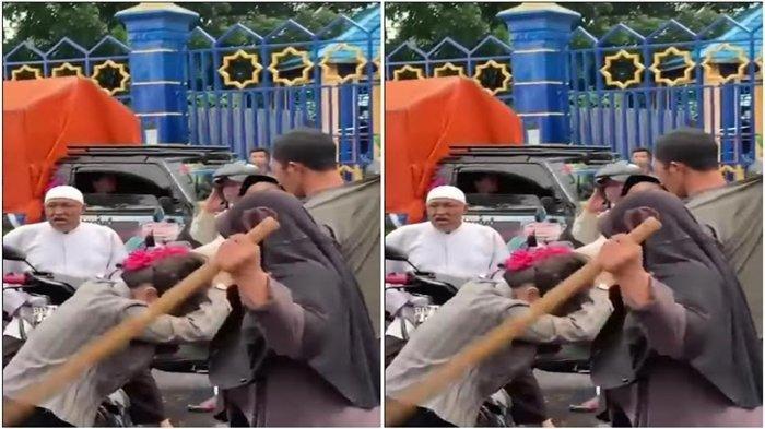 Kemudian pria yang melerai langsung mengatakan "jangan kurang ajar," pintanya sembari menenangkan ibu-ibu jilbab hitam tersebut.