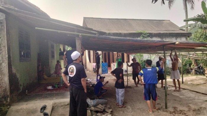 Terlihat pihak keluarga yang dibantu pihak keluarga sedang membuat tenda yang terbuat dari bambu dan terpal di halaman rumah.