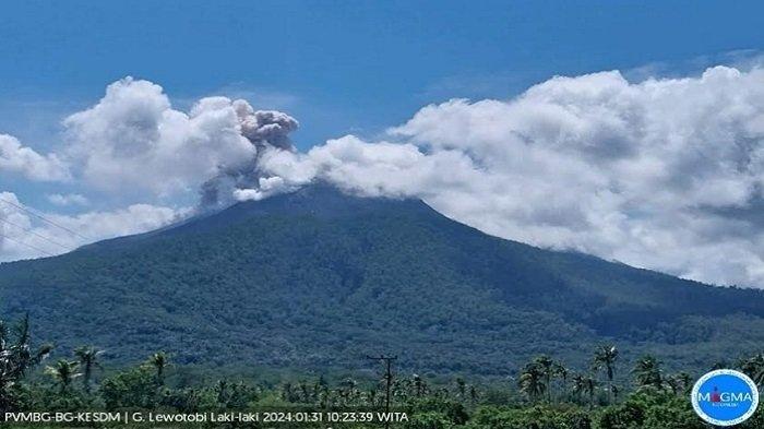 "Telah terjadi erupsi Gunung Lewotobi Laki-laki, Nusa Tenggara Timur pada tanggal 31 Januari 2024 pukul 10:21 WITA dengan tinggi kolom abu teramati ± 700 m di atas puncak (± 2.284 m di atas permukaan laut). Kolom abu teramati berwarna putih hingga kelabu dengan intensitas tebal condong ke arah utara. Erupsi ini terekam di seismogram dengan amplitudo maksimum 47.3 mm dan durasi ± 1 menit 53 detik," tulis Badan Geologi dan PVMBG Pos Pengamatan Gunung Lewotobi Laki-laki.