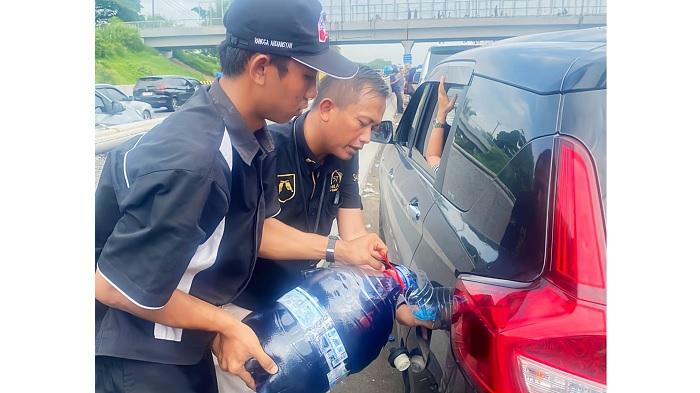 Bensin kemasan tersebut didistribusikan kepada pengendara yang kehabisan BBM di lajur contra flow karena tidak dapat masuk ke dalam rest area.