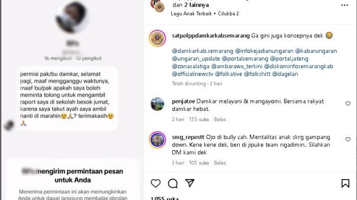 TRIBUNNEWS.COM, SEMARANG - Seorang pelajar di Kabupaten Semarang direct message (DM) instagram @satpolppdamkarkabsemarang untuk meminta mengambilkan rapor.