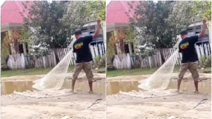 Dalam rekaman berdurasi singkat tersebut, tampak seorang pria menebar pukat—biasanya digunakan untuk menangkap ikan—ke dalam genangan air di tengah jalan rusak.