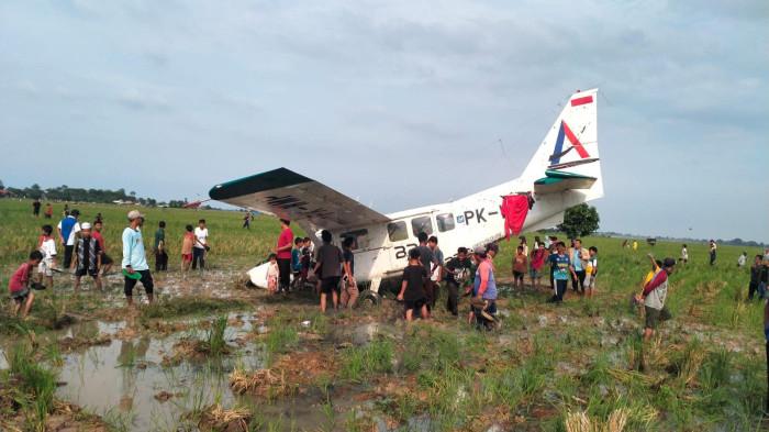 Pesawat GA8 Airvan milik BRO Skydive Indonesia dengan nomor registrasi PK-WMP mendarat darurat di area persawahan Karawang.