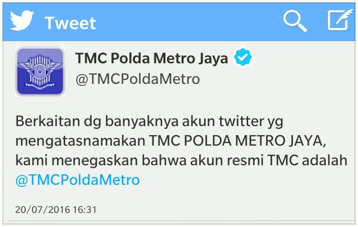 Sebab, akun resmi TMC Polda Metro Jaya adalah @TMCPoldaMetro, bukan @infoTMCPolda.